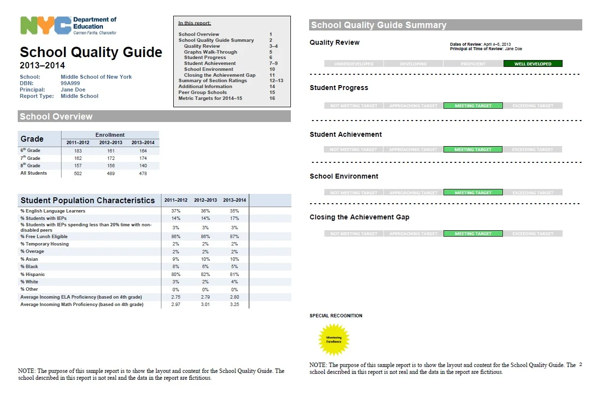 This is a sample for the School Quality Guide. The School Quality Guide was designed for principals and other data savvy users to dig into the information about a school. This was the template that was used to create all 1700+ School Quality Guides for the different schools (and school types) in NYC. For more information on the School Quality Guide, click here to go to Google News. To go to the NYC School Quality Snapshot website for individual school's School Quality Snapshot, click here.