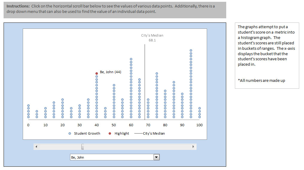 This custom histogram was created in Excel to bring some of the functionality of Tableau and other Data Visualization programs into Excel. The students are placed into bins and are each represented by a blue circle. Additionally, the user can use the scroll bar to highlight an individual student.
